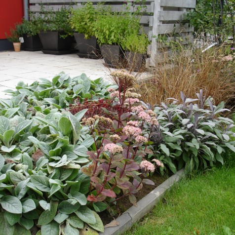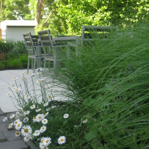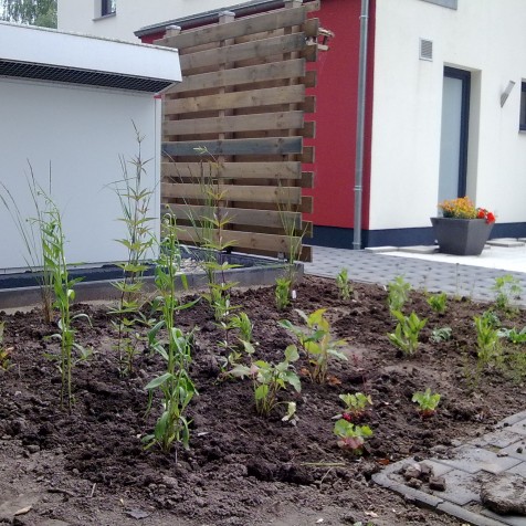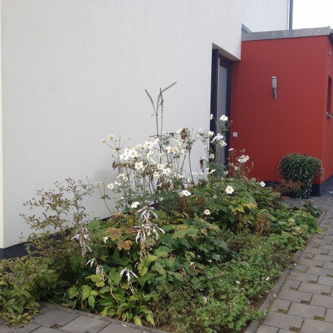 Der Garten grenzt unmittelbar an die Freiflächen einer Grundschule, so dass zur Abgrenzung ein immergrüner Sichtschutz gewünscht war. Mehrere Pflanzbeete bieten aufgrund verschiedener Lichtverhältnisse eine Komposition aus zahlreichen Blatt- und Strukturpflanzen und Blütenreichtum an. Hauptaugenmerk lag auf einen ganzjährigen Blühaspekt, der mit der Sternmagnolie beginnt und in sanften Gräserwogen das Jahr beendet. Die Familie setzt die Pflanzplanung sukzessive um.