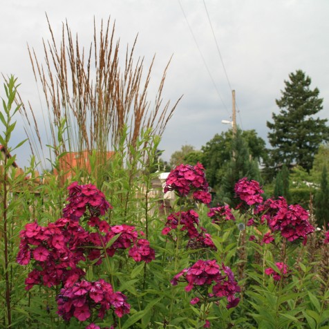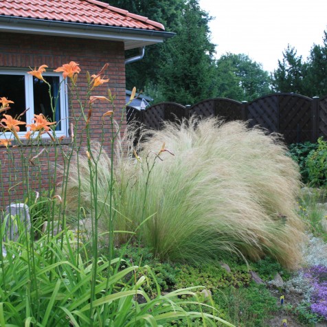 Da das Beet im Entre des Hausbereiches liegt, wünschte der Bauherr einen wirkungsvollen Blühaspekt mit jahreszeitlichen Aspekten. Aufgrund der autochthon bedingten Sandböden wurde der Schwerpunkt auf Gräser und trockenheitsertragende Stauden gelegt.